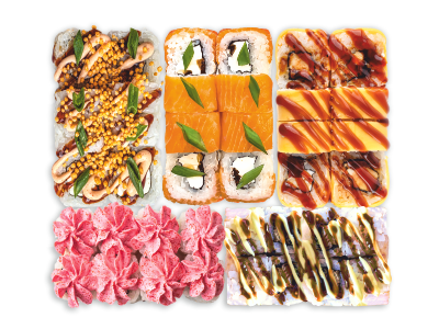 Роллы: филадельфия классическая, филадельфия с икрой лосося, лавина, калифорния с омлетом, нагасима, сырный, имбирная креветка, темпура