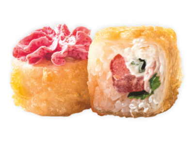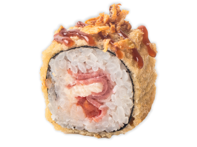 Бекон, сервелат, помидор, моцарелла, кляр, сухари панировочные, соус "Барбекю", лук жареный, рис, нори