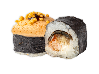 Курица в/к, угорь, сливочный сыр, масаго, майонез, соус "Унаги", шарики рисовые, рис, нори