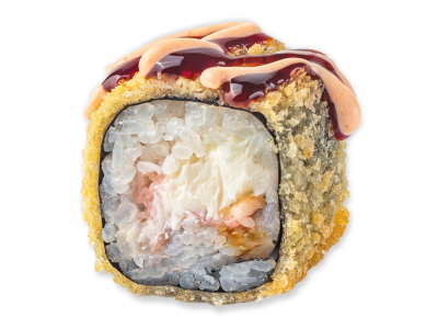 Лосось/форель, сливочный сыр, крабовое мясо имитация, майонез, соус "Унаги", огурец, томаты, рис, панировочные сухари, кляр