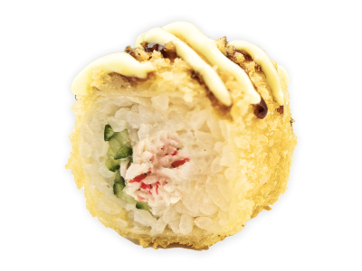 Лосось/форель жареный, крабовое мясо имитация, майонез, огурец, воздушный кляр, сухари панировочные, соус сладко-сливочный васаби, соус унаги, рис, спринг тесто